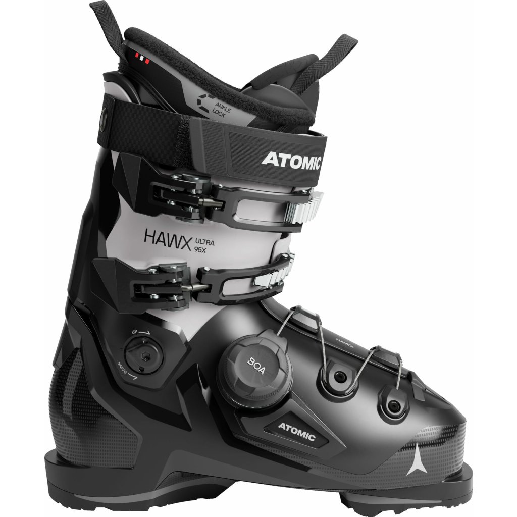 Pohodlné lyžiarske topánky Atomic Hawx Ultra 95X BOA® W majú mäkšiu flexibilitu a sú tolerantnejšie ako iné all-mountain lyžiarske topánky rady Hawx Ultra W – a vďaka kompaktnému strihu 98 mm sú určené pre lyžiarky s úzkymi nohami. Systém BOA® Fit umožňuje jemné doladenie strihu v oboch smeroch pre konzistentné a bezpečné nosenie. Ľahká, no stabilná konštrukcia Prolite vďaka strategickým výstuhám zaisťuje vynikajúci prenos sily na lyže. Energy Link, mechanické spojenie medzi škrupinou a manžetou, poskytuje dodatočný impulz pre prenos sily. Vložka Mimic Silver s predtvarovaným Ankle Lock ponúka okamžité anatomické prispôsobenie a množstvo možností tepelného tvarovania. 3D Stretch priestor na prstoch poskytuje palci extra priestor vo vnútri vložky pre optimálne pohodlie. Memory Fit umožňuje individuálne nastavenie škrupiny a manžety. A odstránením spojlera z nastaviteľnej konštrukcie manžety môžete meniť objem topánky.