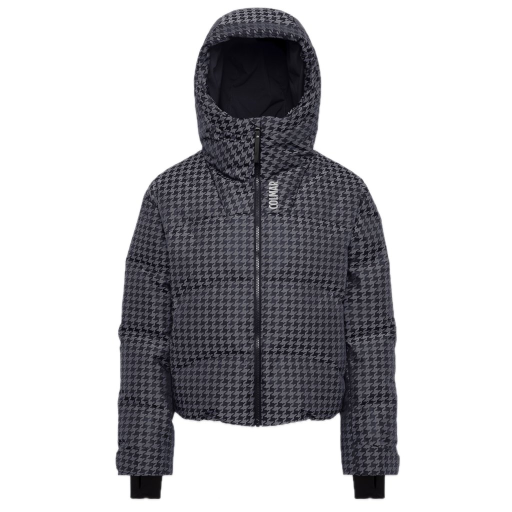 Táto krátka bunda s potlačou kohútieho vzoru a nepremokavou a priedušnou laminovanou tkaninou ponúka mimoriadne intenzívne teplo vďaka elastickej komfortnej podšívke s grafénovými vláknami a vysoko technickej vodoodpudivej páperovej výplni, ktoré zaručujú rovnomerné a optimálne udržanie tepla. Odev, ktorý kombinuje štýl a technickosť, je navrhnutý tak, aby spojil pôvab a funkčnosť na svahu a počas après ski.