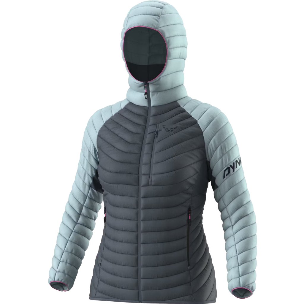 Dámska ľahká a hrejivá páperová bunda s kapucňou Dynafit Radical Down RDS Hooded W s vodeodpudzujúcou úpravou pre ski touringové výpravy a outdoor v chladnom počasí.