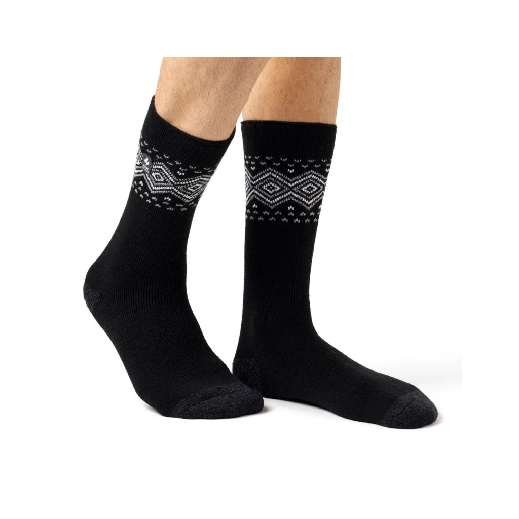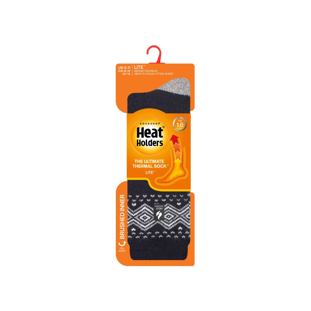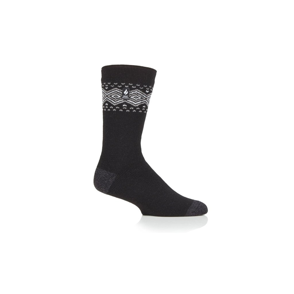 Pánske ponožky značky Heat Holders. Čierno - sivé ponožky zdobí geometrický vzor vo vrchnej časti. Sú štyrikrát teplejšie ako bežné bavlnené ponožky. Poskytujú ideálnu rovnováhu medzi hrúbkou a hrejivosťou, vďaka čomu si budete môcť užívať dlhotrvajúce pohodlie počas celej zimy.