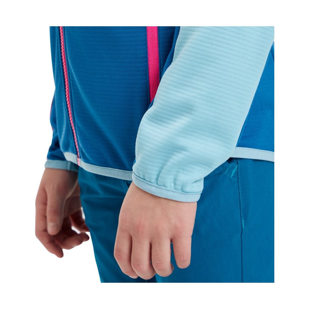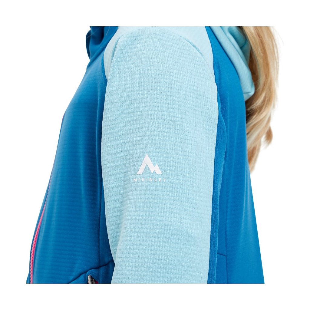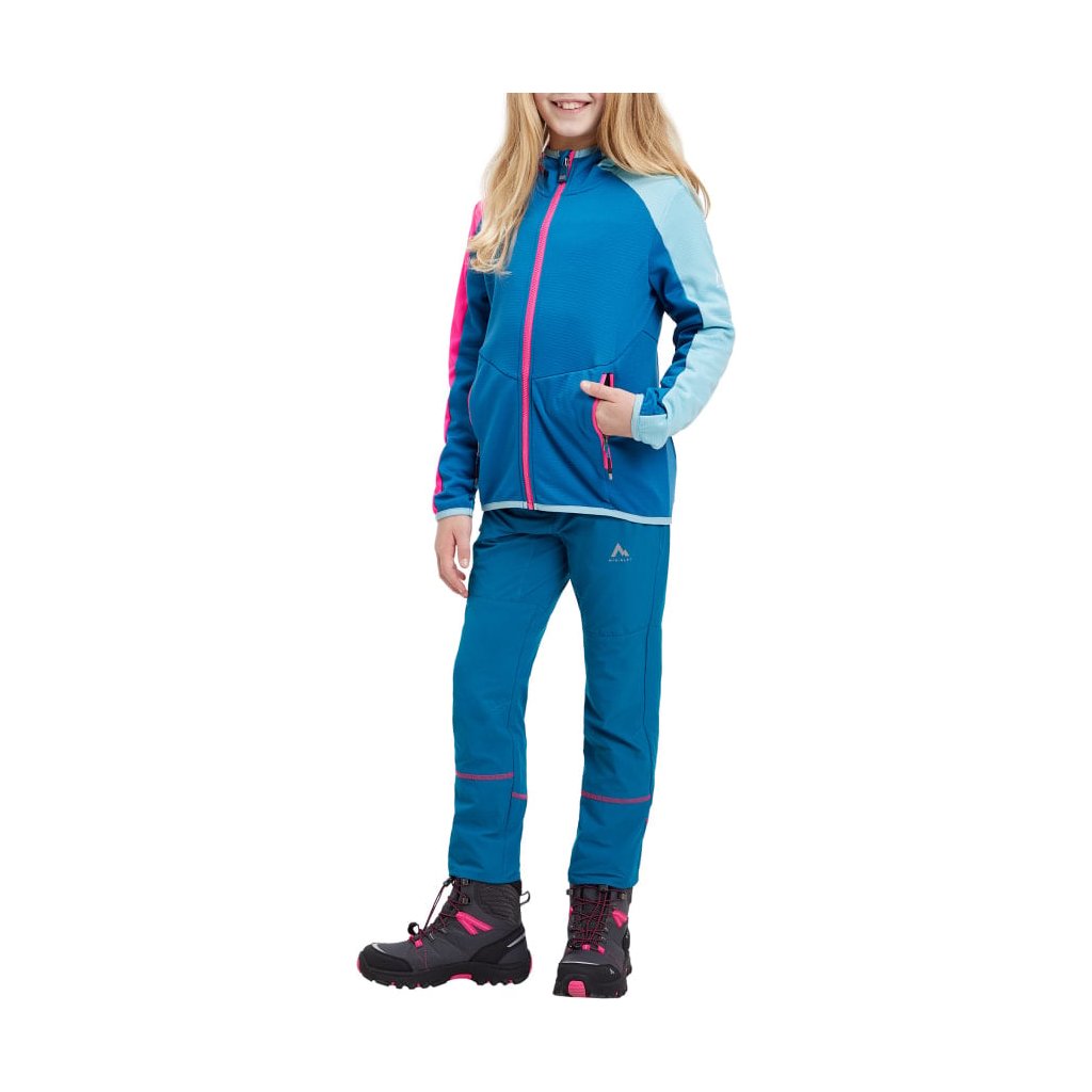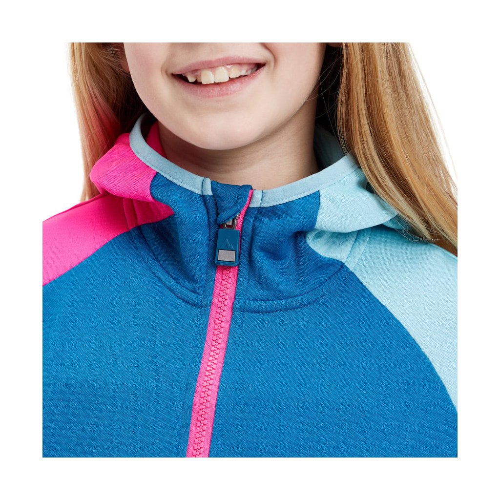 Dievčenská outdoorová mikina McKinley Seth HD Hooded Fleece Jacket Kids je vyrobená z viac ako 50 % recyklovaného polyesteru a má pevnú kapucňu a elastický spodný lem a manžety, ktoré zabraňujú chladu.